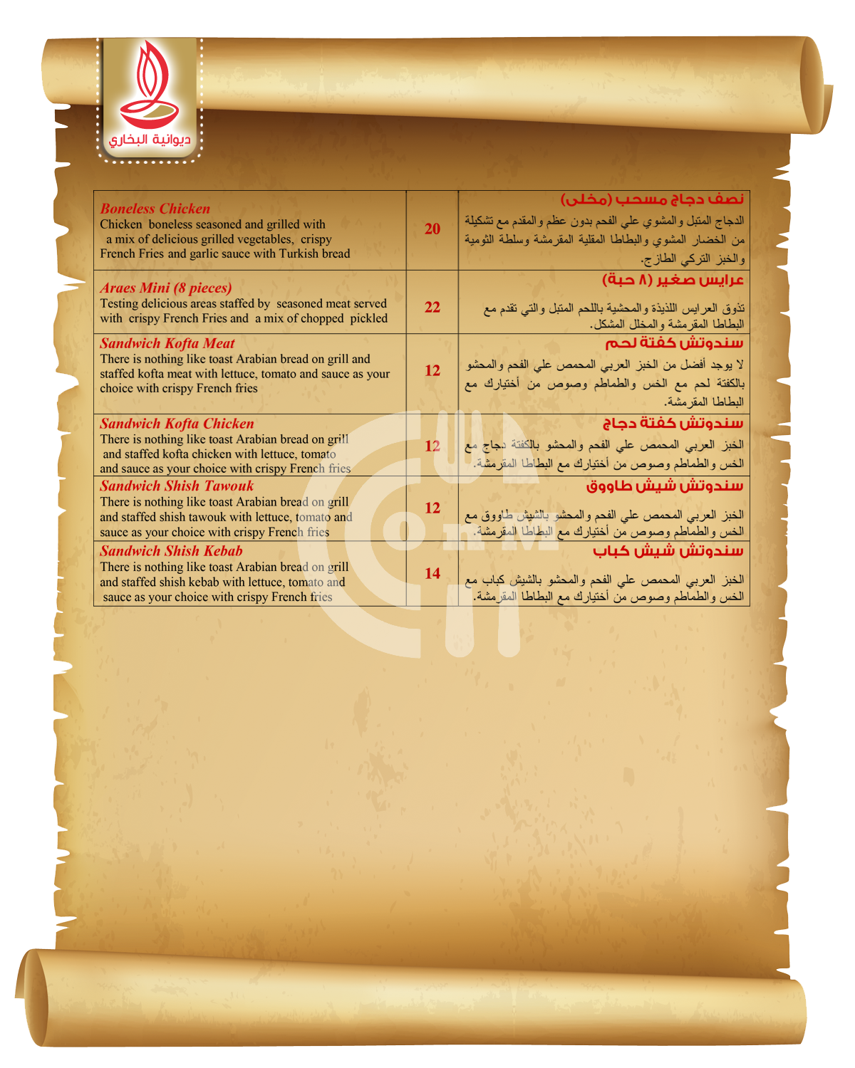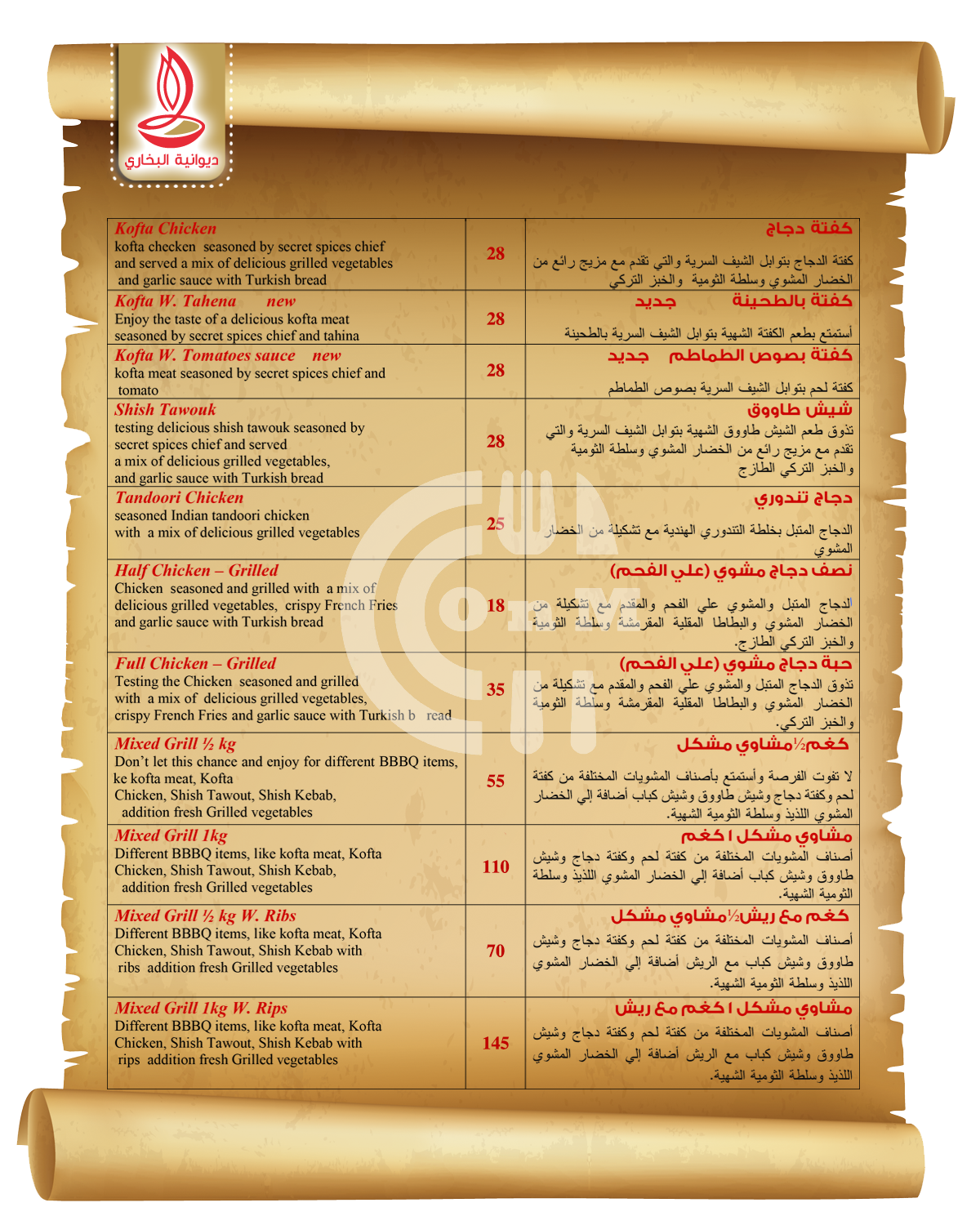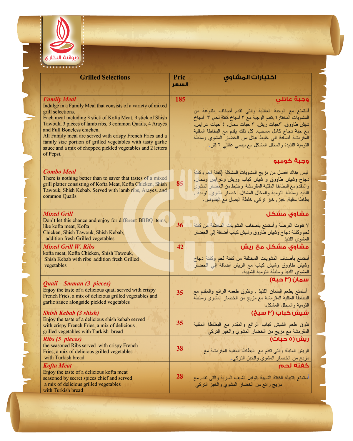 Diwaniyat Al Boukhari is available for delivery at your locationDiwaniyat Al Boukhari serves as an eatery located in Qatar, serving a selection of Grills, Shawarma, Biryani that delivers across Abu Sidra, Ain Khaled, Al Aziziya, Al Bidda and Al Dafna.