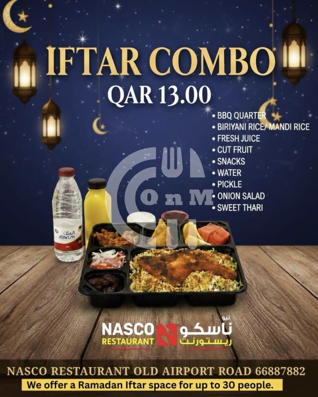 For only QAR 13, enjoy a complete meal with BBQ,rice, juice, fruits & more! Gather your family & friends we also offer Iftar space for up to 30 people.