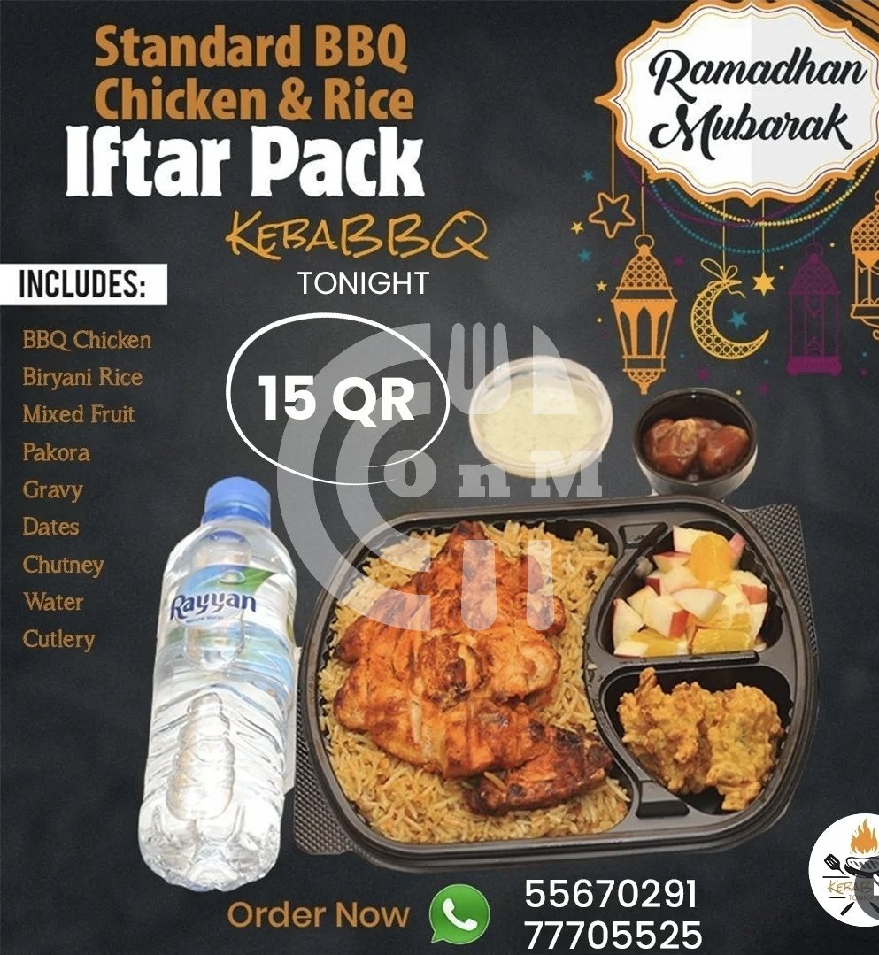Iftar Pack Includes: BBO Chicken Biryani Rice Mixed Fruit Pakora Gravy Dates Chutney Water Cutlery