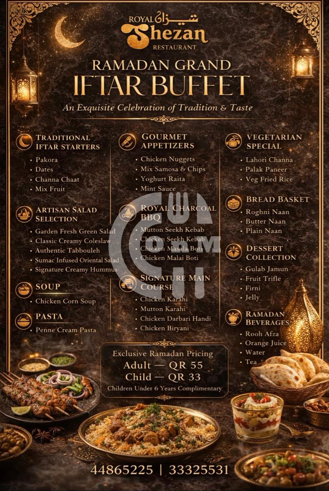 Break your fast with elegance at Royal Shezan Restaurant and indulge in our Ramadan Grand Iftar Buffet – a rich celebration of authentic flavors sizzling BBQ, aromatic biryani, traditional desserts and refreshing Ramadan beverages