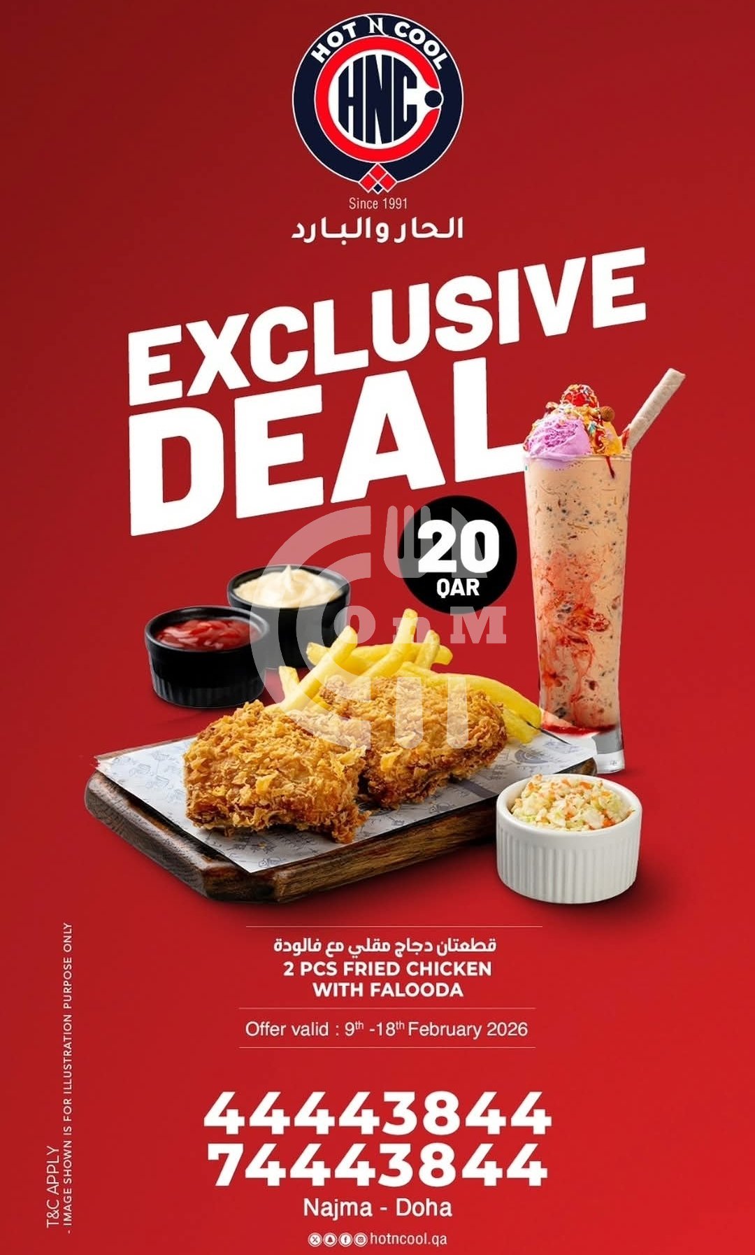 Only valid for dine in and take away.Exclusive Deal – 2pc Fried Chicken with Falooda for 20 QAR at Hot n Cool
