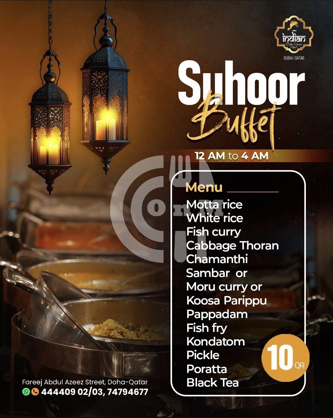 Enjoy our special Suhoor Buffet for just 10 QAR Delicious flavors, cozy vibes, and the perfect late-night gathering spot.