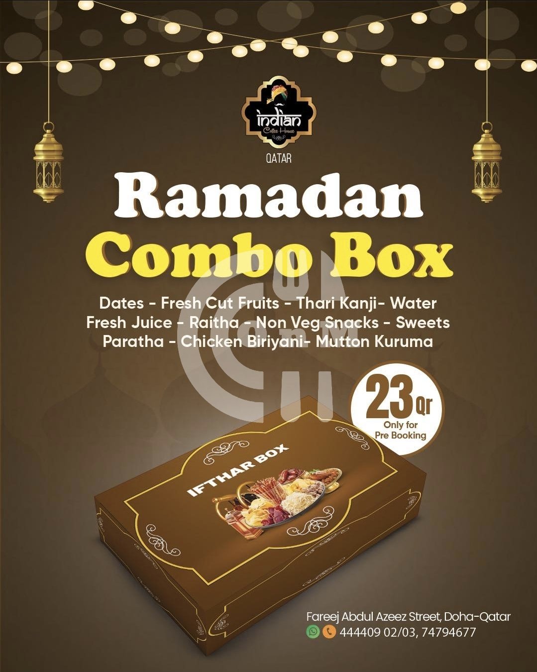 Introducing the Ramadan Combo Box from Indian Coffee House Qatar a complete meal with dates, fresh fruits, Thari Kanji, snacks, sweets, Chicken Biriyani, Mutton Kuruma and more.. ideal for office, travel or home Iftar.