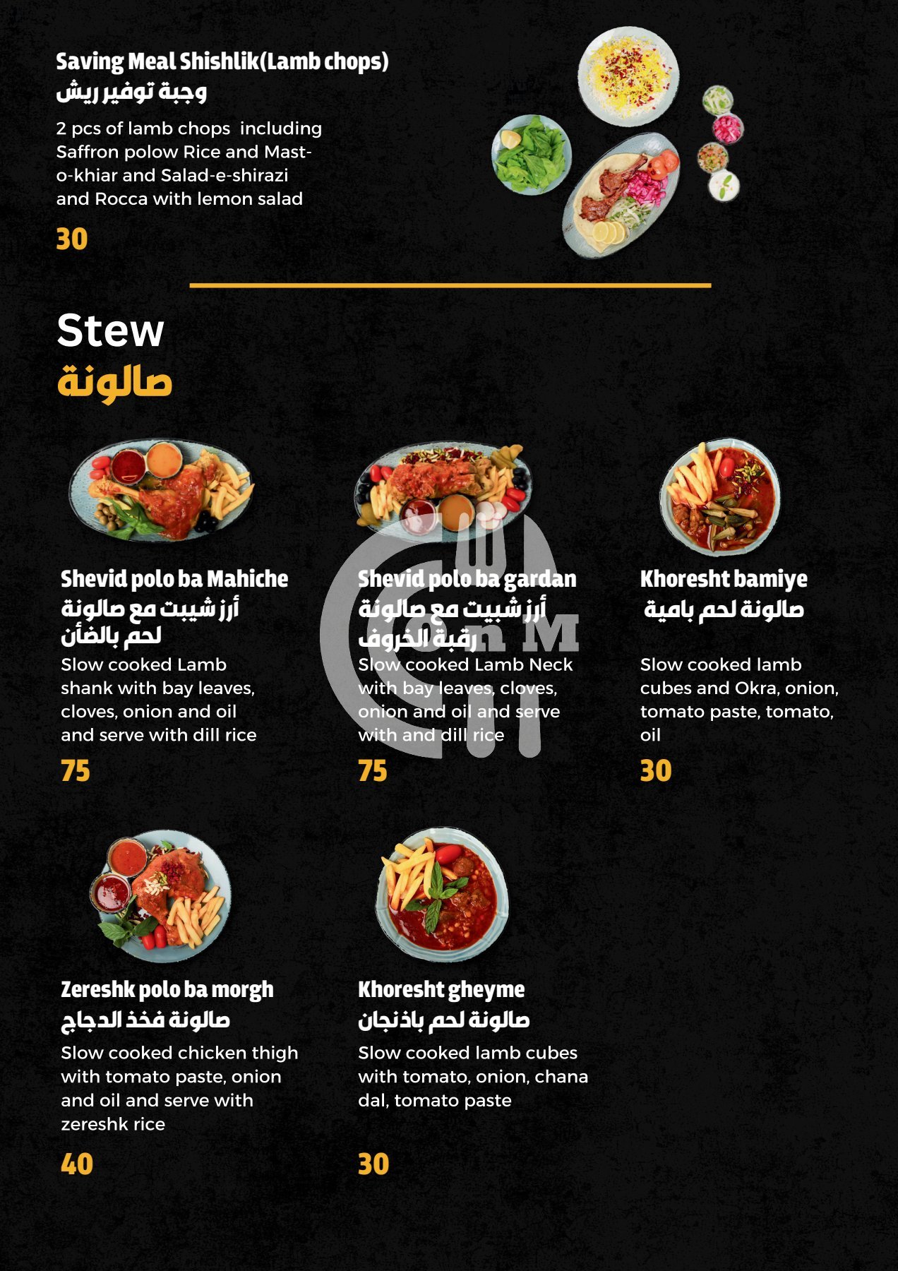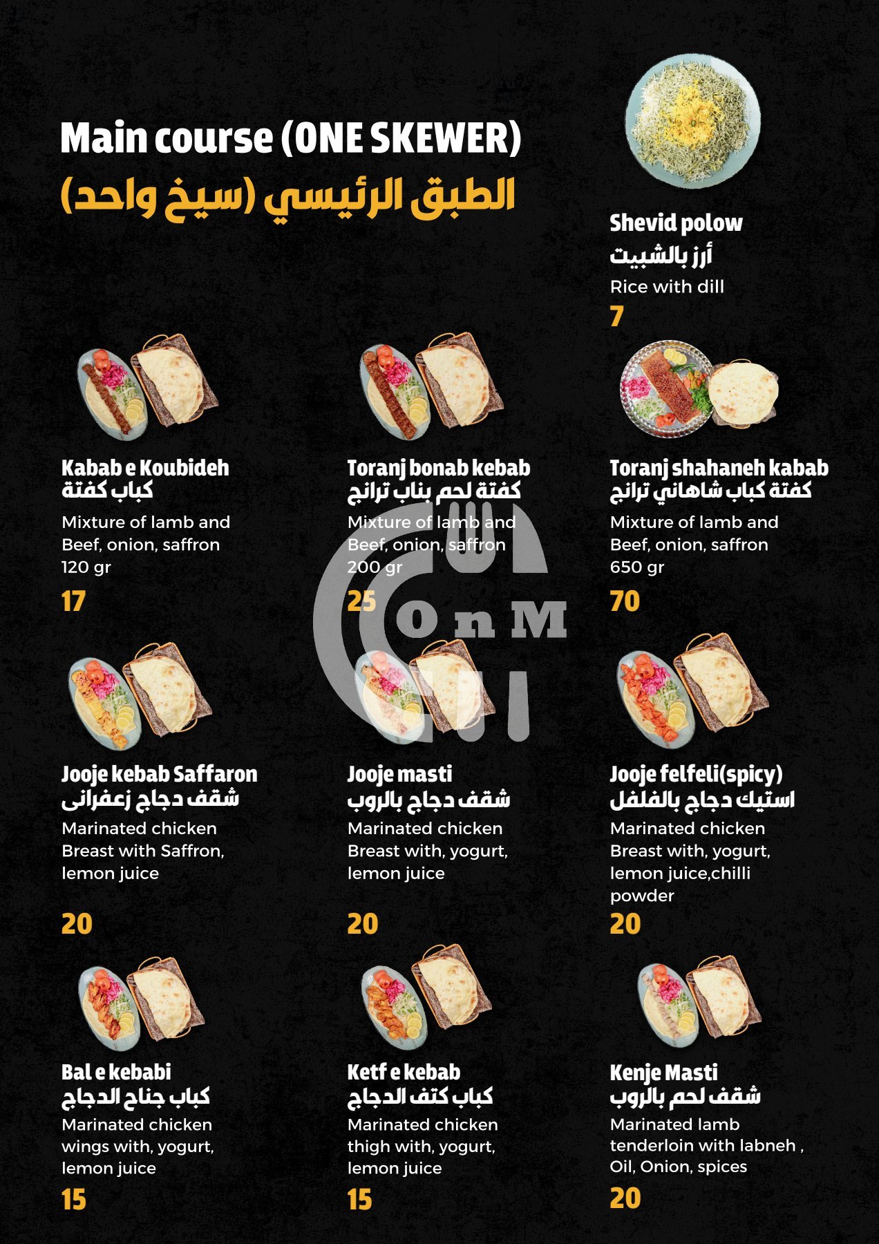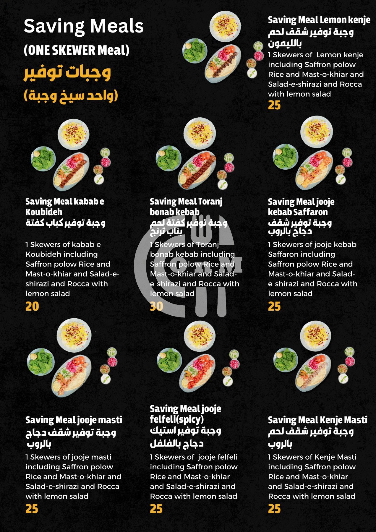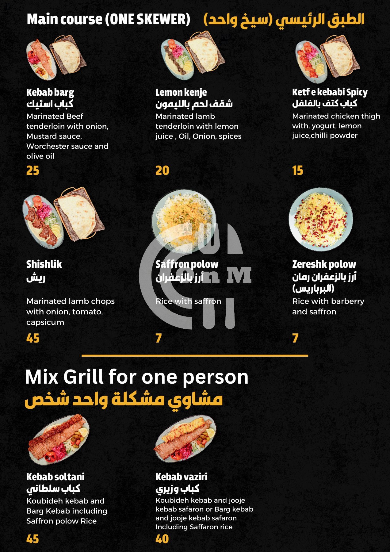 Their best selling dishes are Zereshk polo ba morgh, jooje kebab Saffaron, Toranj bonab meat kebab and jooje felfeli(spicy), although they have a variety of dishes and meals to choose from like Grills, Iranian, Kebab.
