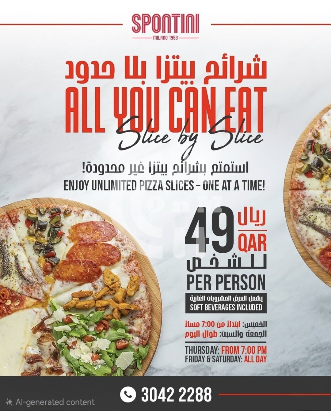 Order your favorite slices again and again (and again @) – unlimited, as much as you can eat! Just 49 QAR per person & sodas are included!
