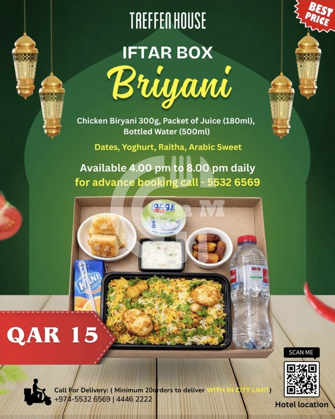 Enjoy a simple and satisfying Iftar Box at Treffen House, available daily during Ramadan for just 15 QAR.